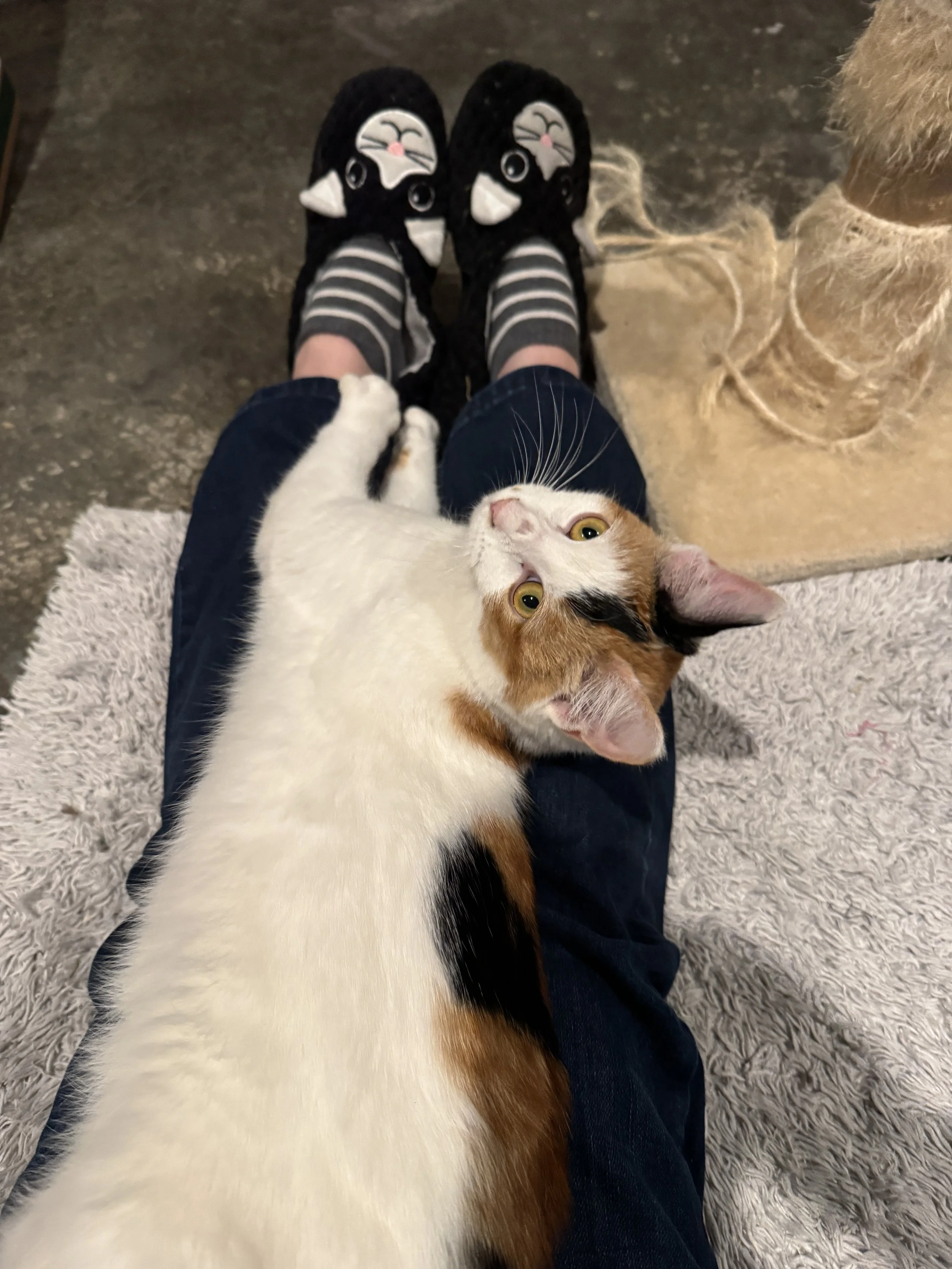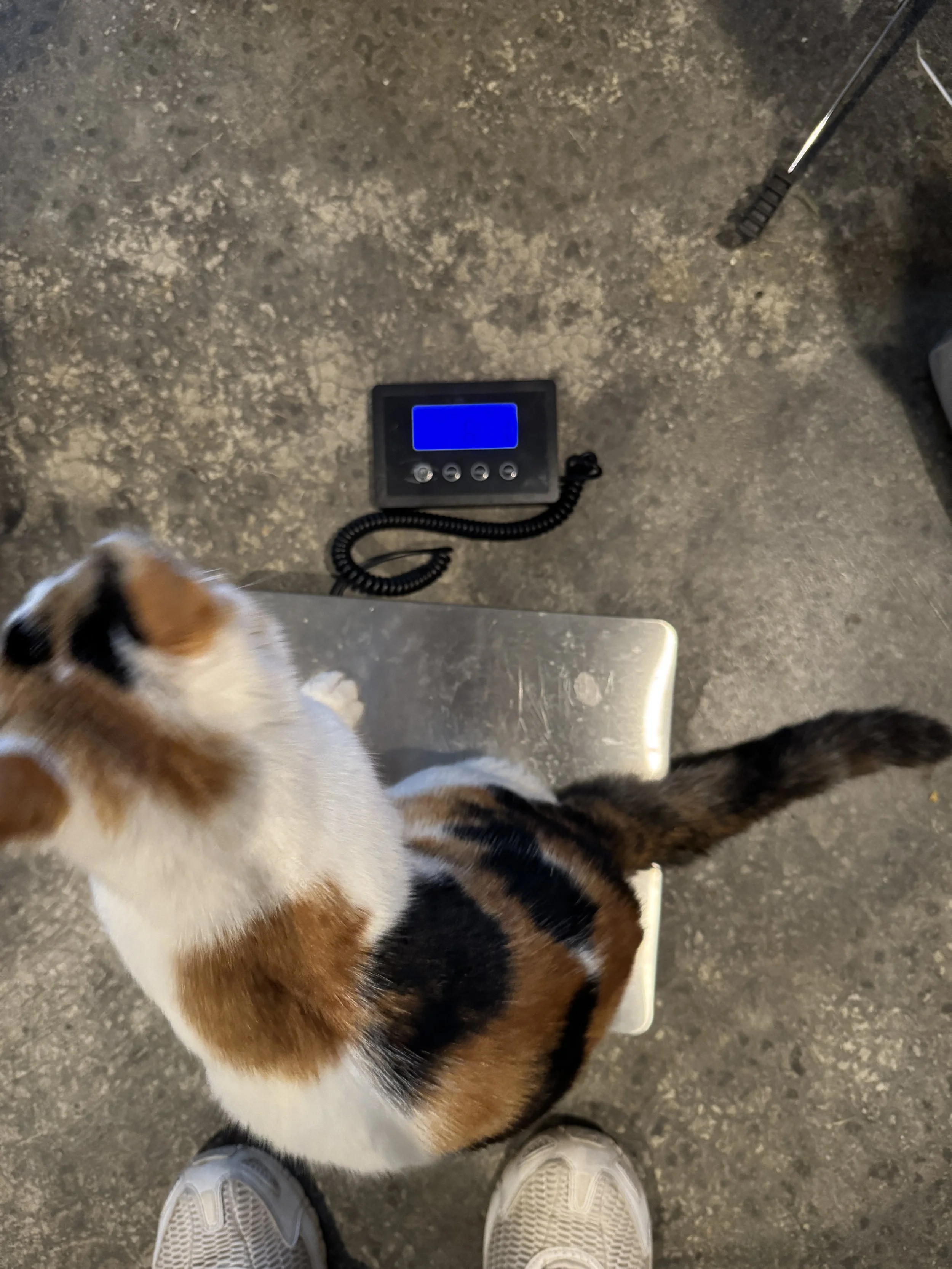Yesterday I “helped” a bunch in the garage while some cleaning and organizing was happening. I decided to weigh myself too. 6 pounds 1 oz! Still using a litter box and being a playful snuggly kitty :)