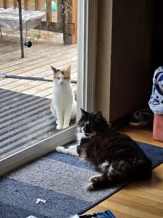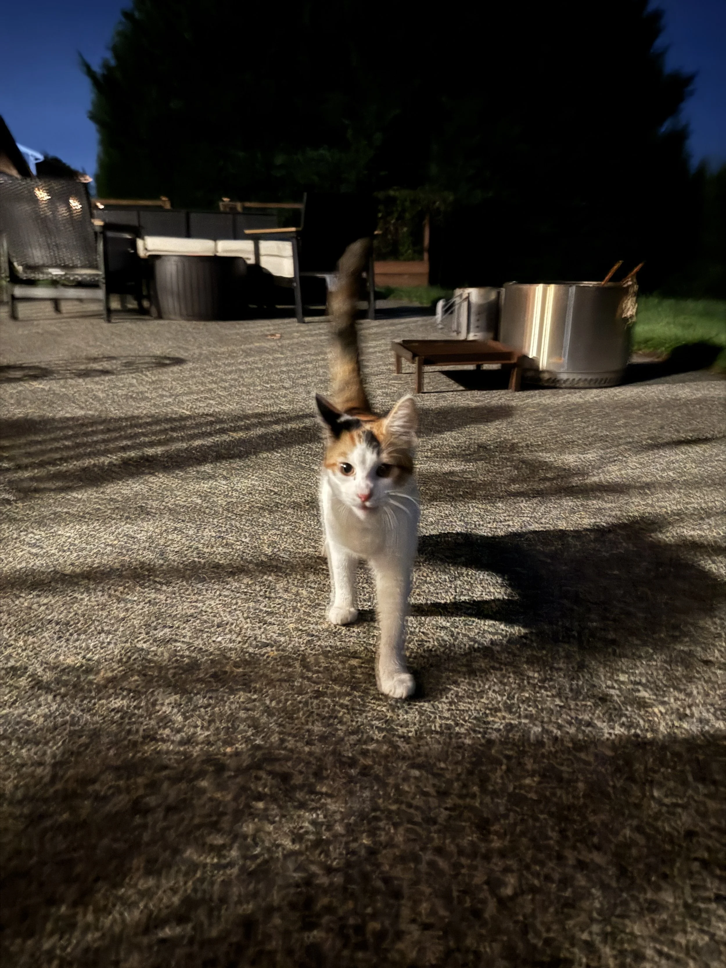 I’m still trying to find somewhere to be that’s safe. It’s getting colder and rainy. A lady next to the first house heard me meowing in a scary place and let me jump into her yard. I followed her to her backyard after her dog went inside. So now I’ve found another nice neighbor with a porch I can visit! Good thing these people have some cat food on hand and places for me to hide out when needed!