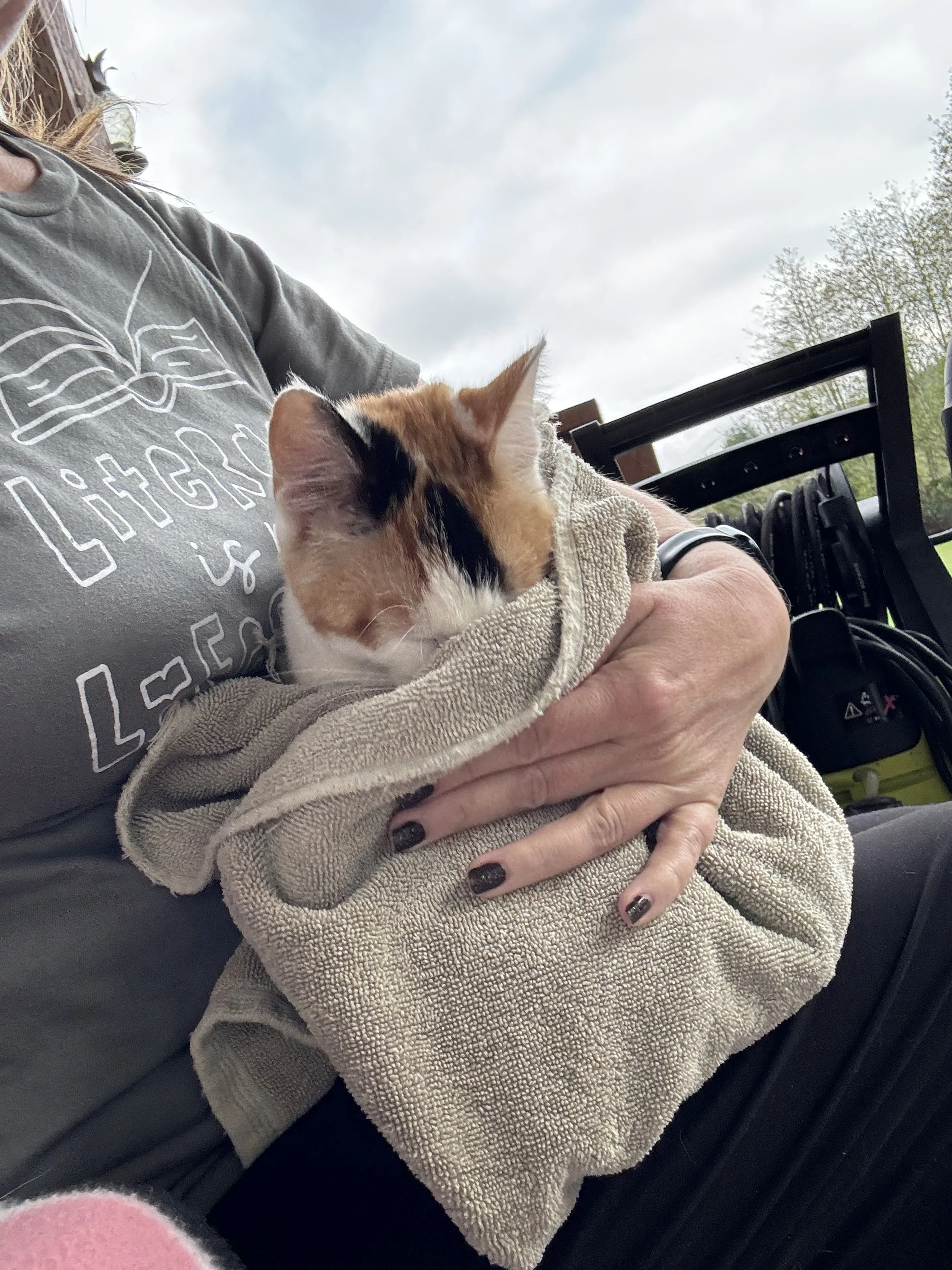 Each morning when I get fed now, I’m also getting a snuggle in a warm towel. I was able to visit inside the garage for a couple hours yesterday while the lady was cleaning. Of course I was a typical kitten climbing on everything, but she didn’t get too frustrated with me. I was told I will be allowed to sleep in here inside a crate when it gets REALLY cold until I find a warm forever home. I need to pass a litter box test soon. Shouldn’t be too hard right?